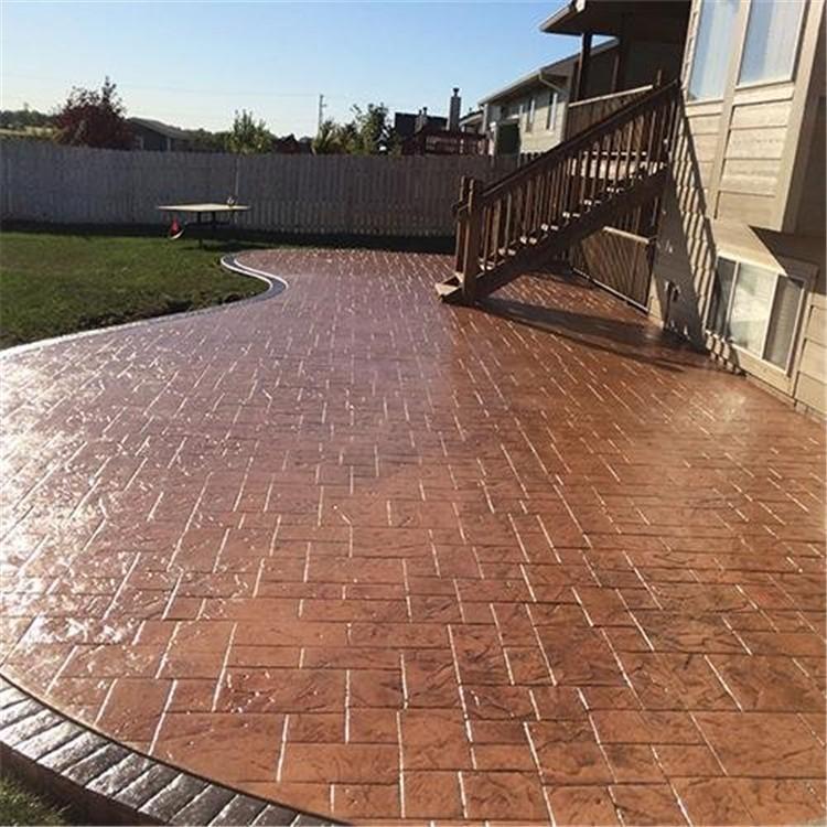 5、使用藝術(shù)地坪模具對(duì)地坪面層進(jìn)行紋理處理。藝術(shù)地坪模具應(yīng)配套使用,首先確定好紋理的分布方向,選好一塊模具放置的位置和角度,然后其它的模具依次緊貼一塊模具放置。彩色混凝土藝術(shù)地坪壓模采用壓模,壓模應(yīng)由技術(shù)較好的人員進(jìn)行作業(yè)以保證壓紋深度一致和模具放置的準(zhǔn)確性。